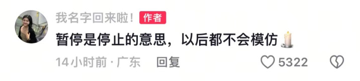 她又在评论区表示:“暂停就是停止的意思,以后都不会模仿。”值得注意的是,“中S”ID也同时更改为“我的名字回来啦!”。